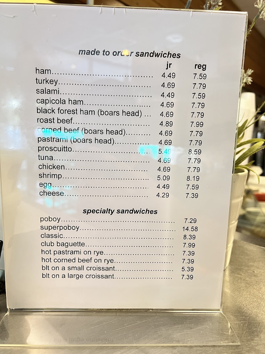 The deli also offers various salads and classic soups such as chicken noodle and cream tomato soup. Freshly made bread, croissants, and rolls are available to complement the sandwich selections.